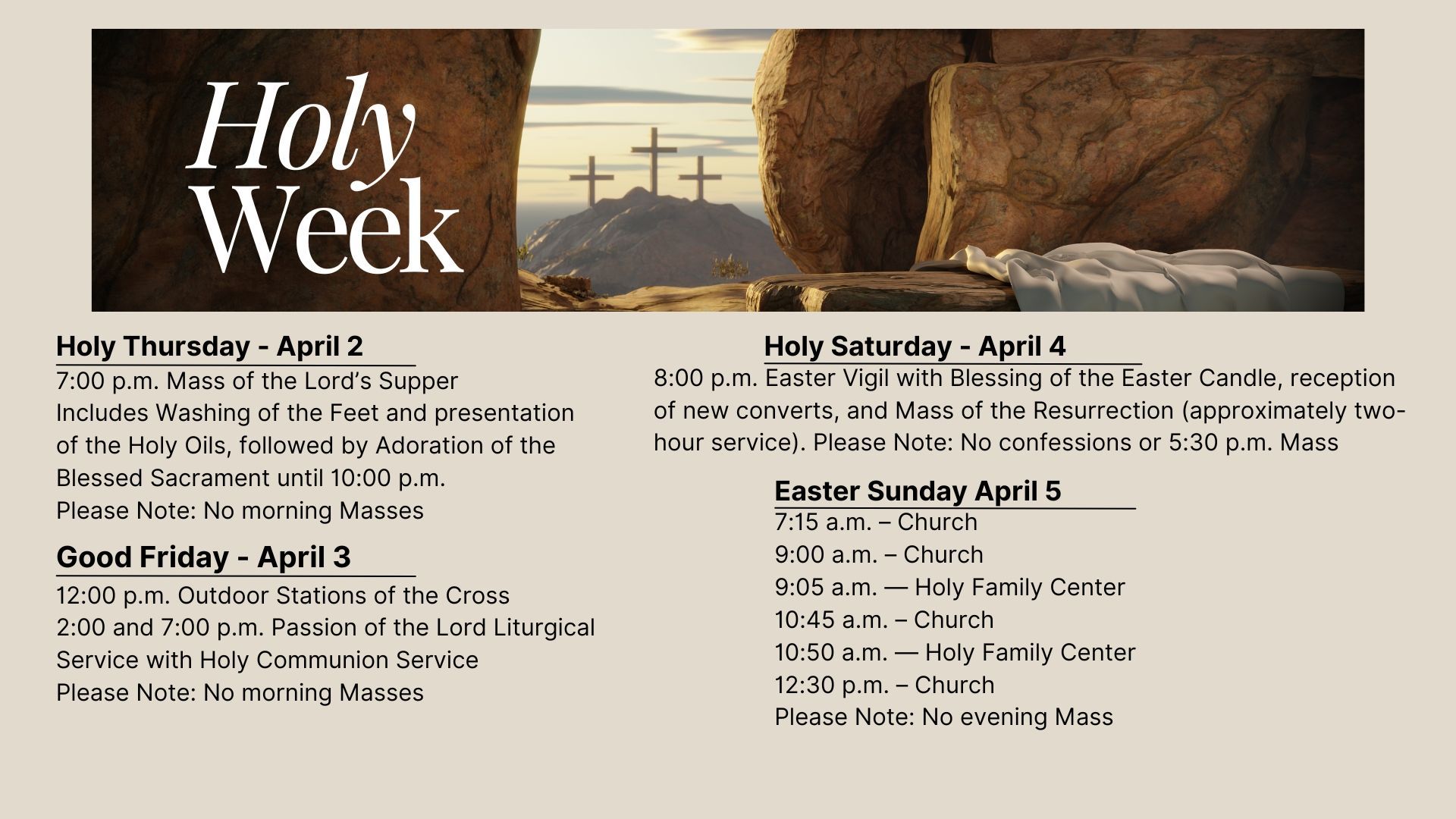 Pope Leo has asked our parish to support the Pontifical Good Friday Collection, which helps Christians in the Holy Land, where they are now less that 2% of the population. Your support is essential to help the Church minister in parishes, provide Catholic schools, and offer religious education. The Pontifical Good Friday Collection also helps to preserve the sacred shrines of Christianity, including in Jerusalem, Nazareth, and Bethlehem, to name a few. The pandemic had his Christians in the Holy Land particularly hard. Most of them depend on pilgrimages for work. The war made their situation even more dramatic. In these times of crisis, the Pontifical Good Friday Collection is necessary to meet the basic needs of the People of God still living in this Land and to maintain a Christian presence where the Church was born. When you contribute to the Pontifical Good Friday Collection, you join with Catholics around the world in solidarity with the Church in the Holy Land. PLEASE BE GENEROUS!