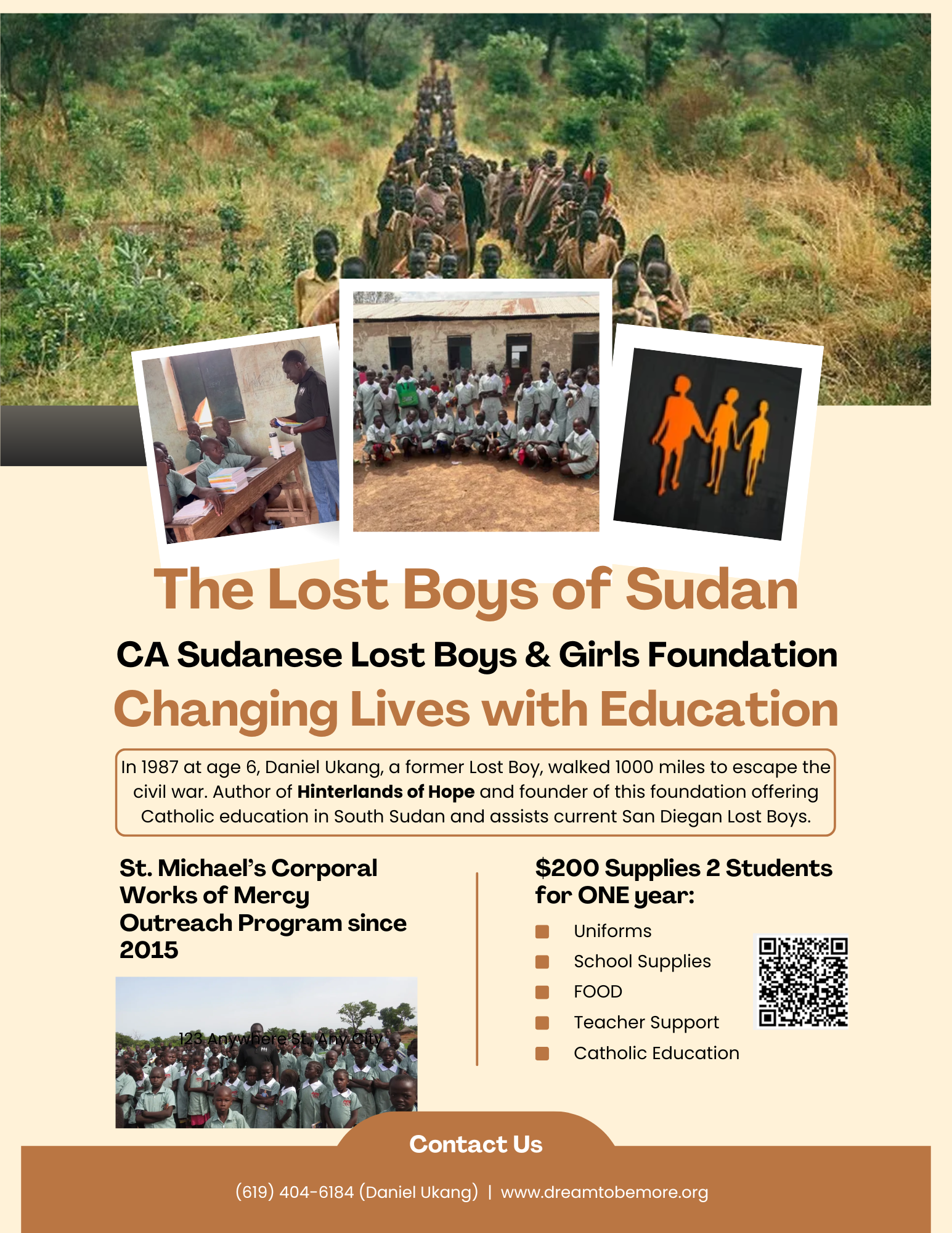 Our Corporal Works of Mercy Ministry assists the Lost Boys with programs such as educational scholarships, dental-care funding, emergency assistance, and a speakers bureau that provides public speaking to raise awareness of the journey and plight of the Lost Boys and Girls.